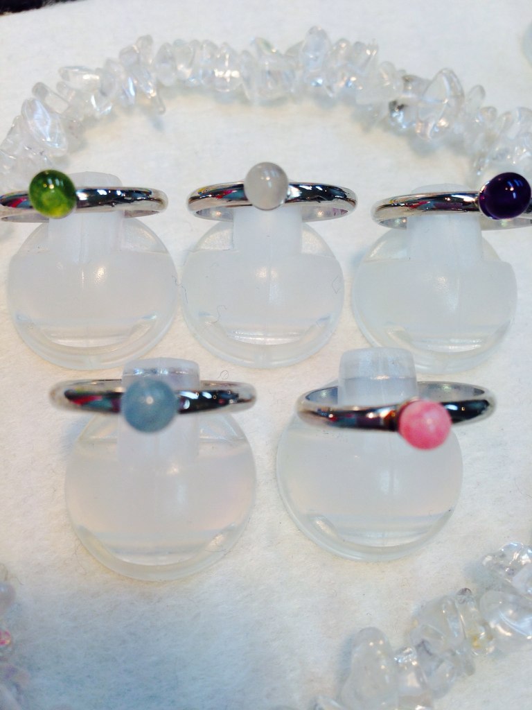 写真、左上からペリドット、ムーンストーン、アメジスト、手間の左から