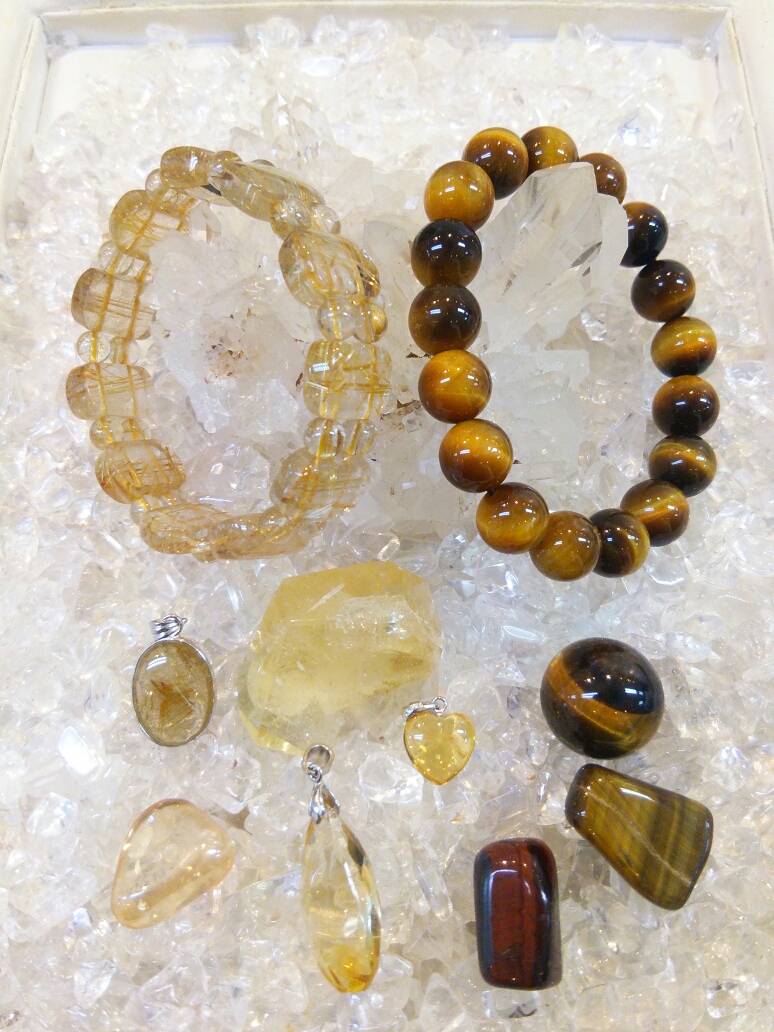 左から、困難に打ち勝つパワーを与え、商売を繁栄させるシトリンに、金運、仕事運、勝負運にオススメのタイガーアイ、そして水晶の中でも最強のパワー、金運強化、運気向上のルチルクォーツ