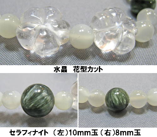 フラワーモチーフの水晶や深い緑のセラフィナイトをプラスして♪