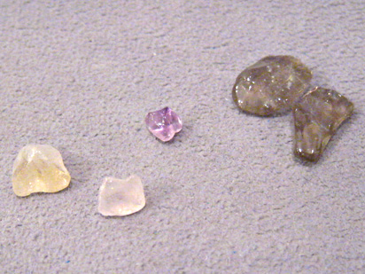 左からシトリン、ローズクォーツ、アメジスト、スモーキークォーツです。