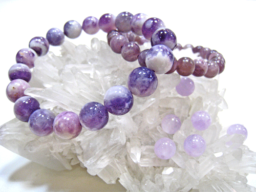 天然石:手前から ラベンダーアメジスト(8ミリパーツ/1粒¥189)、ティファニーストーン(ブレスレット¥36,750)、レピドライト(ブレスレット¥2,790)