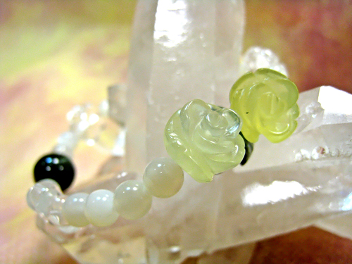 フラワーモチーフの水晶や深い緑のセラフィナイトをプラスして♪